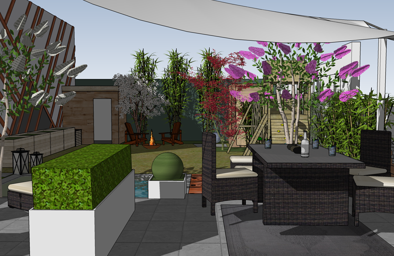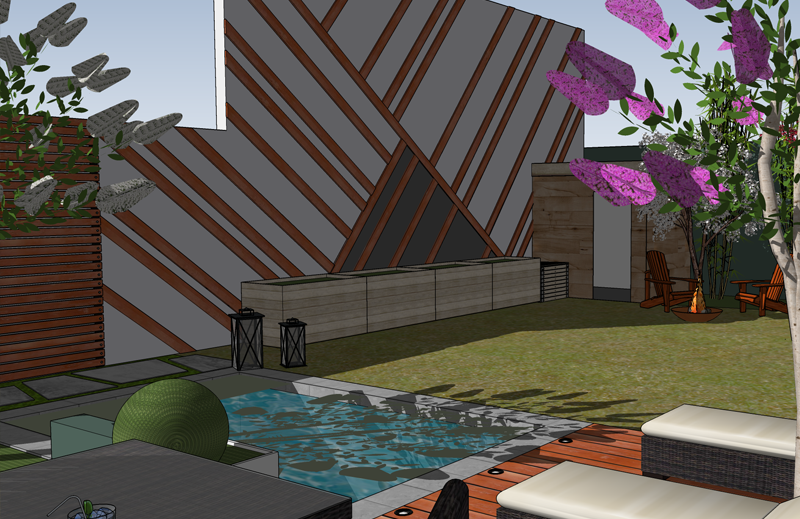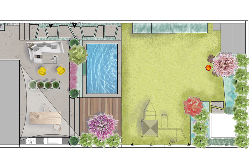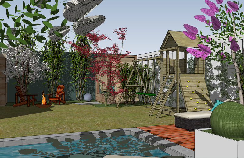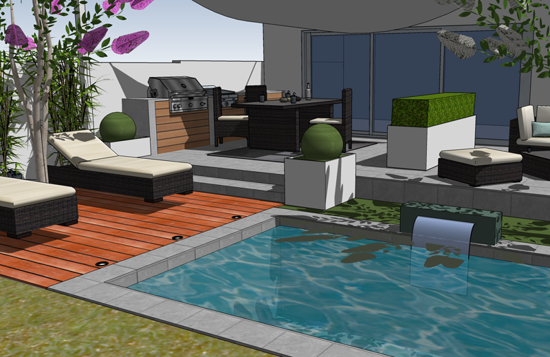 Ce projet a été conçu en définissant un espace convivial sur une terrasse attenante à la maison. La piscine en contrebas possède une jolie plage en bois IPE et un mur d’eau qui apporte une douce ambiance sonore. Au fond du jardin, un petit boudoir avec un daybed permet de s’isoler dans un petit coin de tranquillité. Cet espace est totalement entouré de plantes pour une ambiance balinaise !
